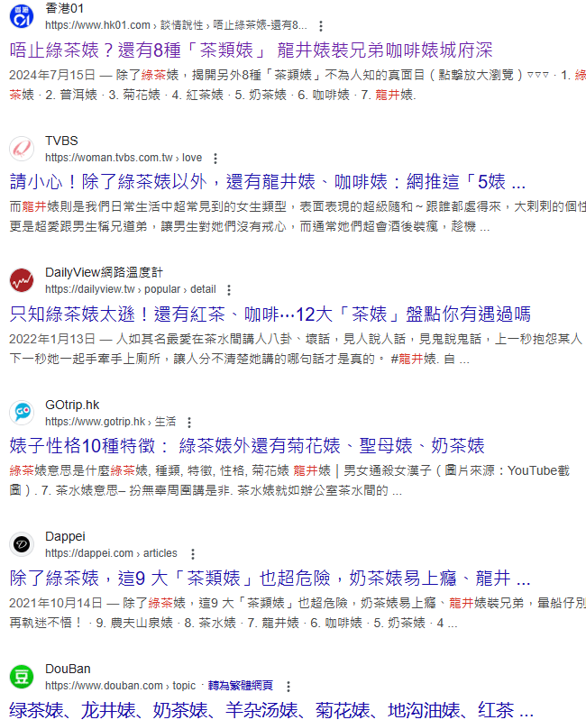 之後也演變出許多用法:紅茶、奶茶、龍井目…把女性行為做很細緻的切分,甚至有些細緻到可能自己都不小心被涉指(連男性也會有的行為也列進去)