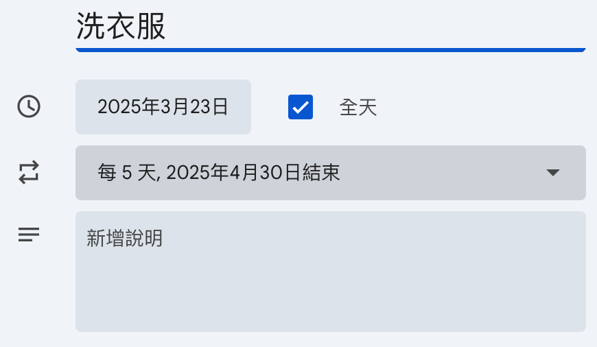 (如果是有想養成的習慣,可以用google calender的工作 –> 重複提醒)