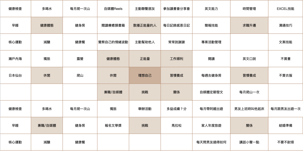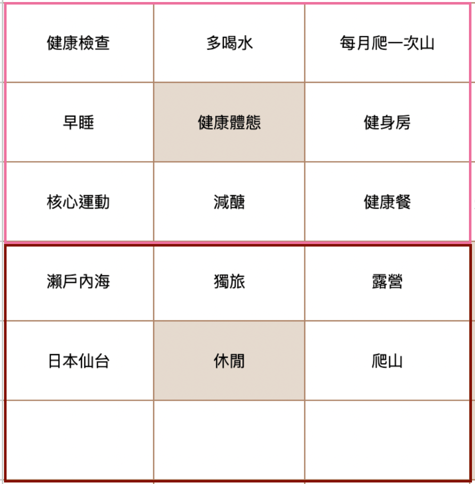 接下來記得,規劃生活要以此人可能會做的事情去設想例如健康可能是多運動、早睡早起、健康飲食、戒掉不良習慣、健康餐,也可能是情緒方面的健康,如果太多向建議挑3個今年可以測試的方向就好,例如「健康餐」以現在的租屋條件或常加班的型態根本不可能,建議可以先放置。有的九宮格事件也會發生在別的九宮格(例如我的「健康體態」跟「休閒」有重疊的事件),不用強求都要發想不一樣的任務,或是不用硬是填滿九宮格,因為我們必須看清一年其實很短,除了生活還有工作、課業,真的沒辦法兼顧那麼多!絕對不是許下很多願望就是很認真過生活的人!