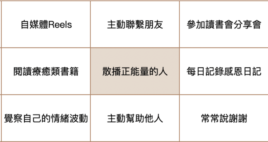 將想像的具體目標細化,例如我的「散播正能量的人」做法拆解如下,而這些各自的方法也可以各自形成九宮格,例如療癒類書籍又可以分成8本書,主動幫助他人也有很多做法,將目標細緻拆解,如想寫一篇文?那你第一步就是訂出標題就好,第二部可以是先擬架構。